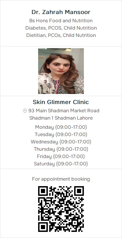 Dietitian, PCOs, Child NutritionSkin Glimmer Clinic, 93 Main Shadman Market Road Shadman 1 Shadman Lahore (1) Contact: 03054998887