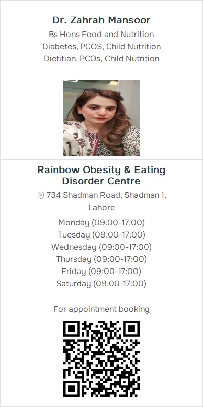 Dietitian, PCOs, Child NutritionRainbow Obesity & Eating Disorder Centre, 734 Shadman Road, Shadman 1, Lahore (1) Contact: 03054998887